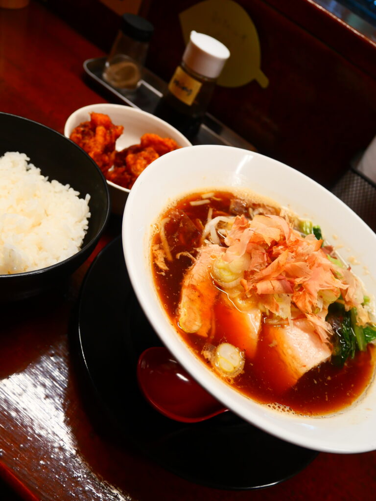 魚介しょうゆラーメン + 白ご飯 + 唐揚げ のセット