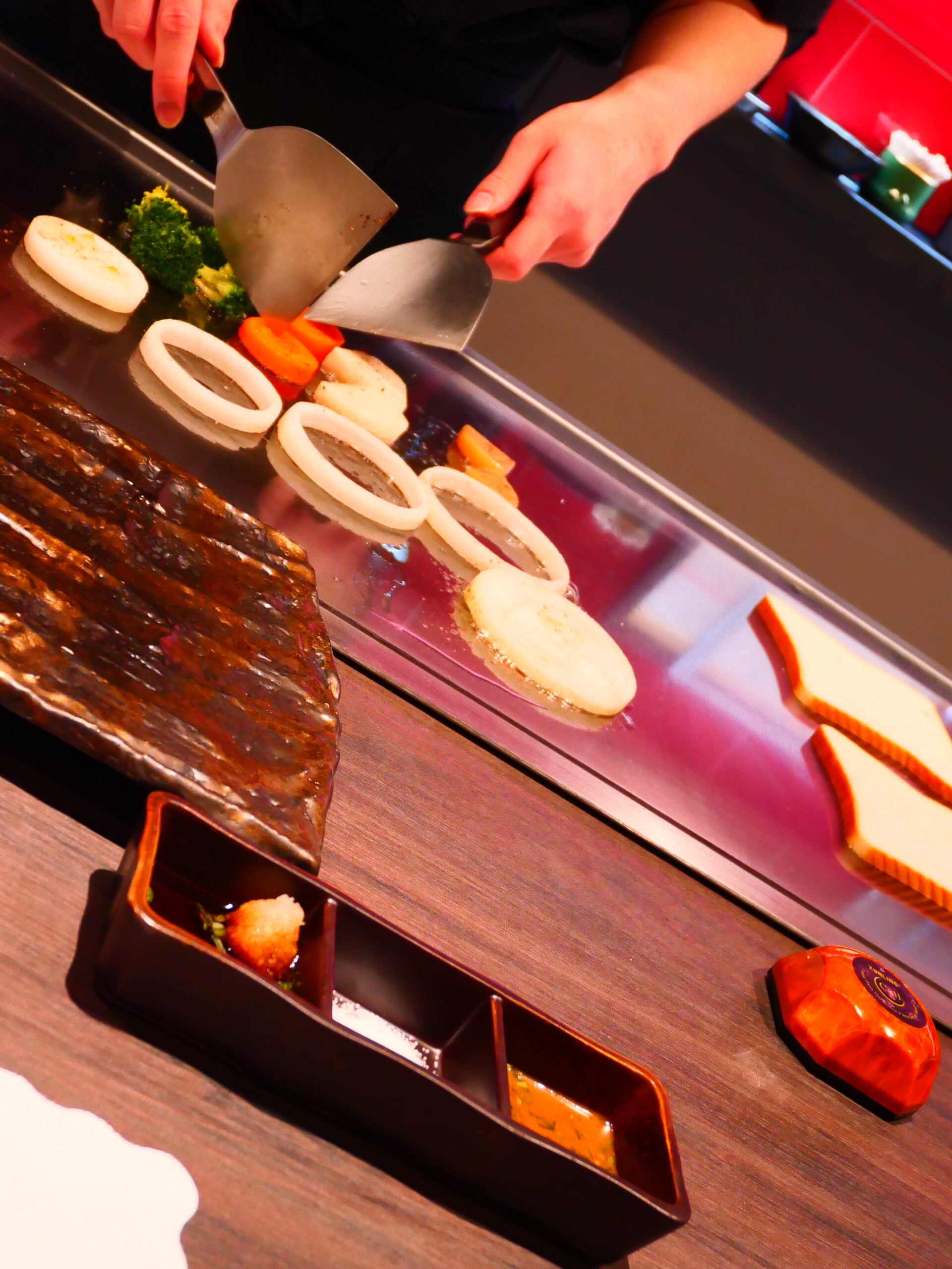 スタッフの方が野菜やお肉を目の前で焼いて提供してくださって